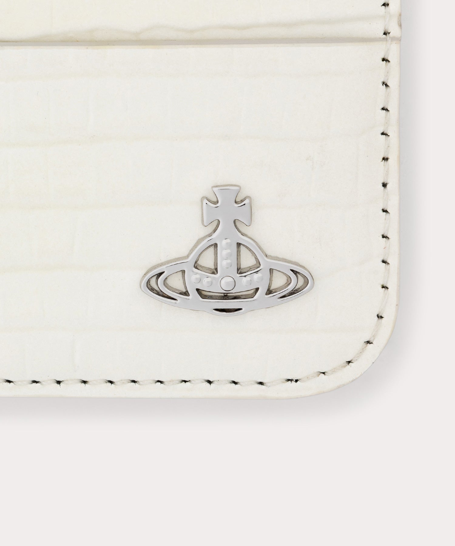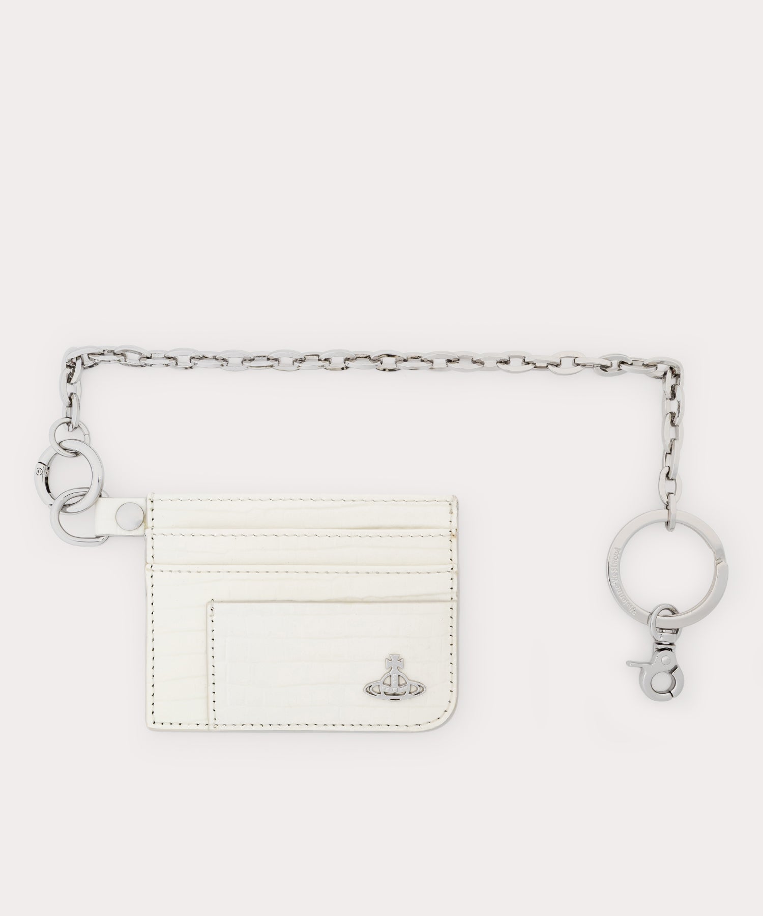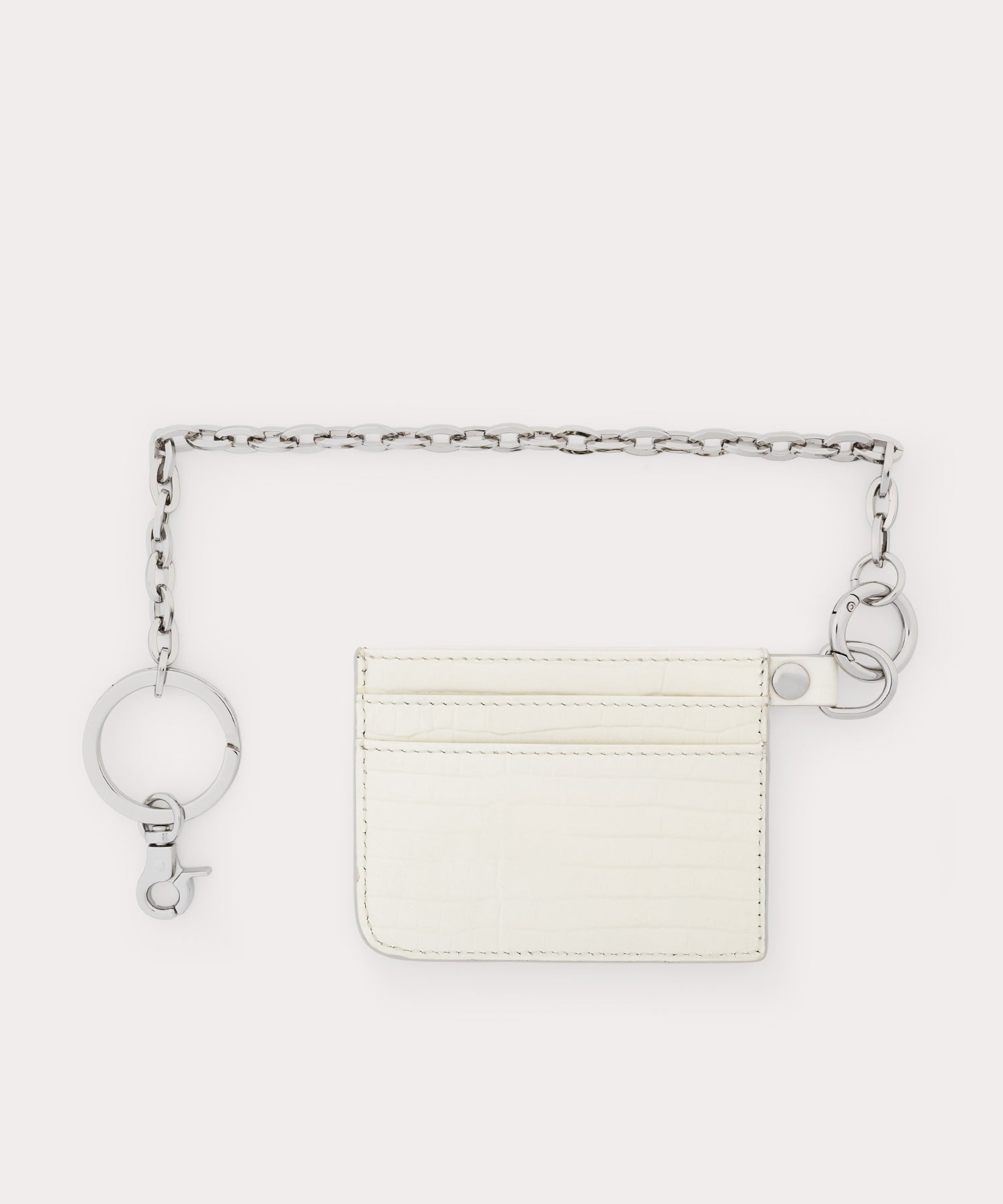 牛革を使用しクロコの質感を型押しした「MINI CROC EMBOSSED チェーン付カードケース」。クラシックなハードウェアのディテールが施されています。取り外し可能なチェーン付きなので、バッグの持ち手やベルトループに付けることも可能です。