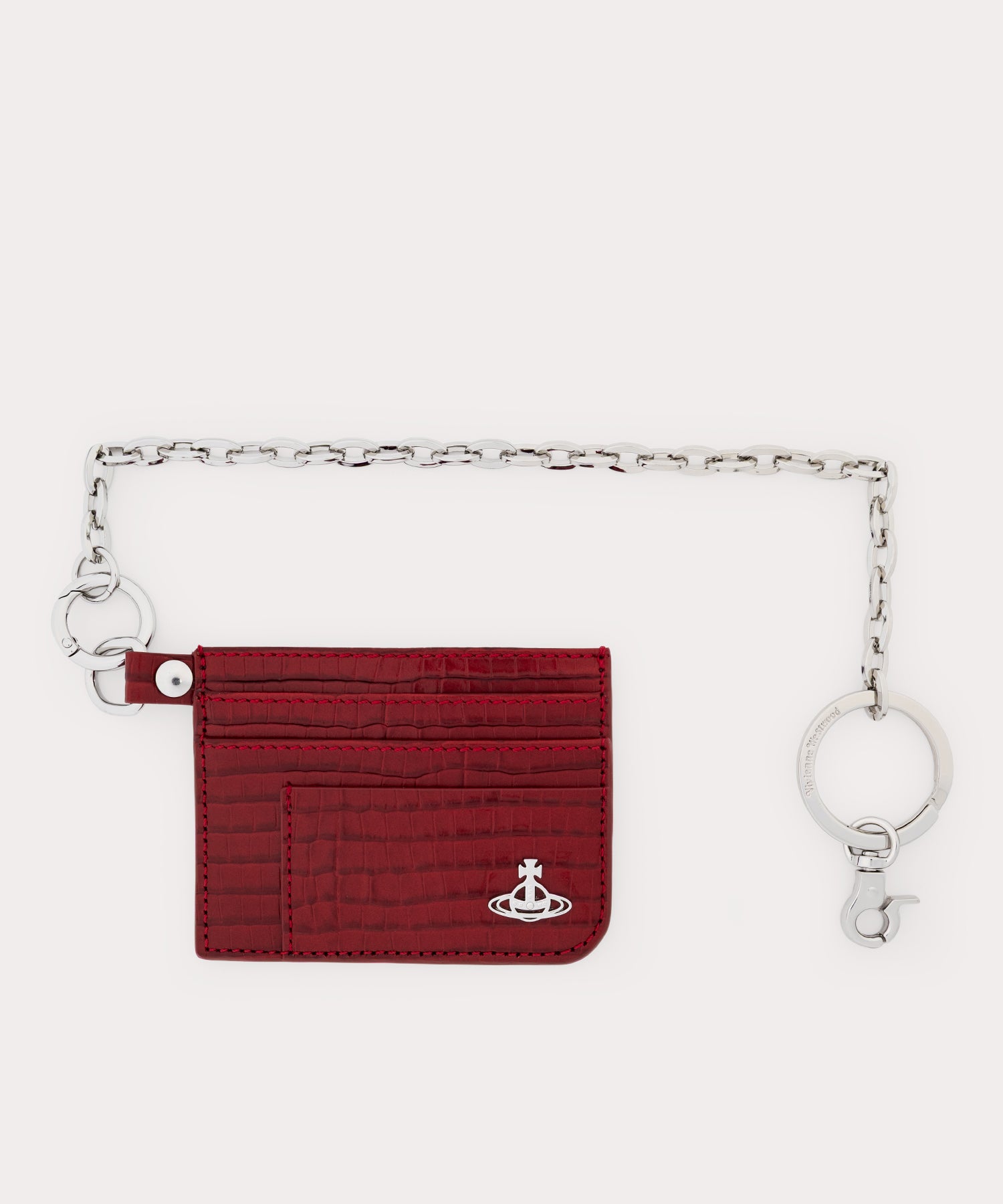 牛革を使用しクロコの質感を型押しした「MINI CROC EMBOSSED チェーン付カードケース」。クラシックなハードウェアのディテールが施されています。取り外し可能なチェーン付きなので、バッグの持ち手やベルトループに付けることも可能です。