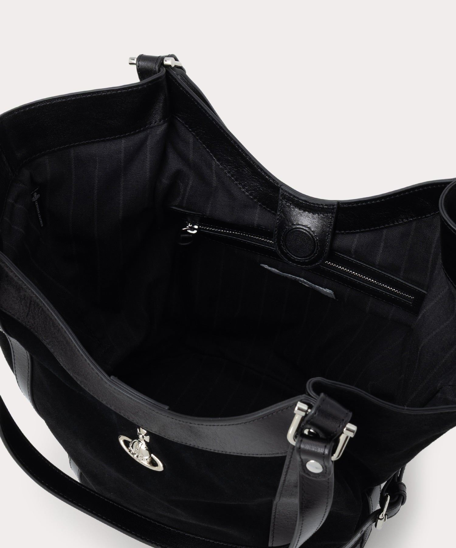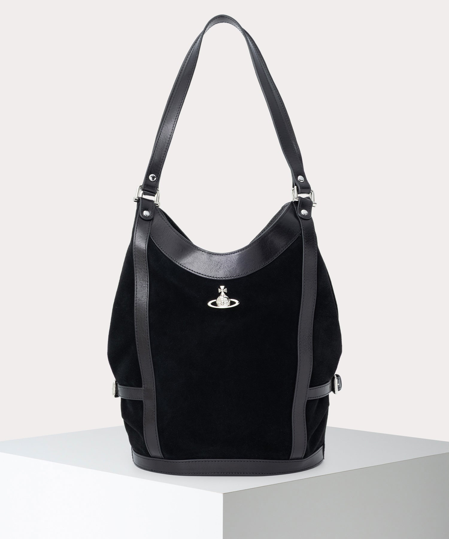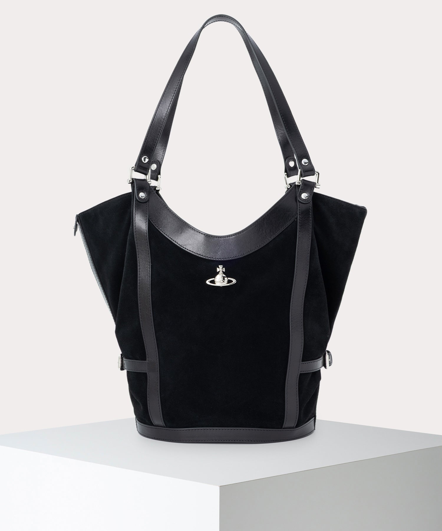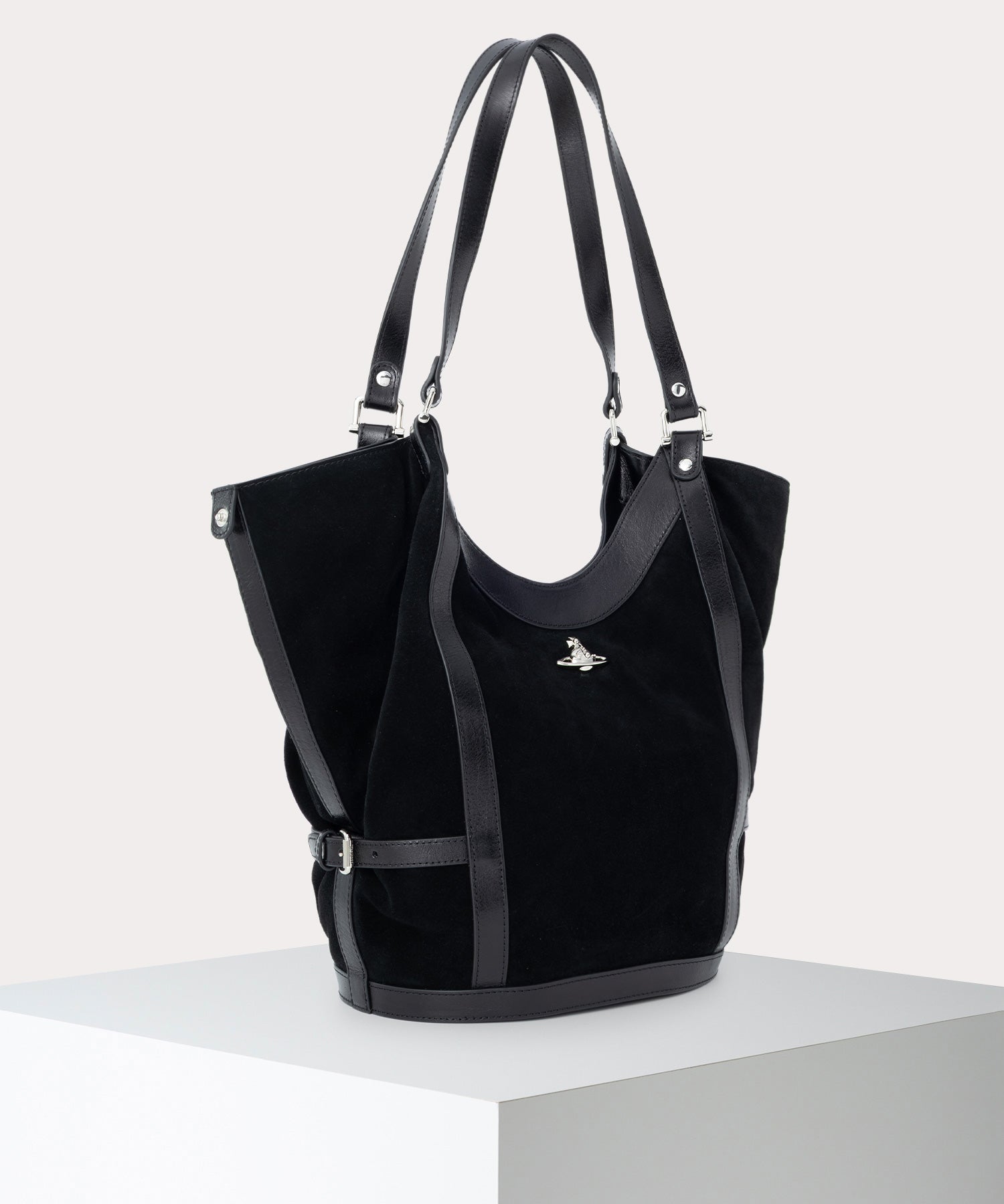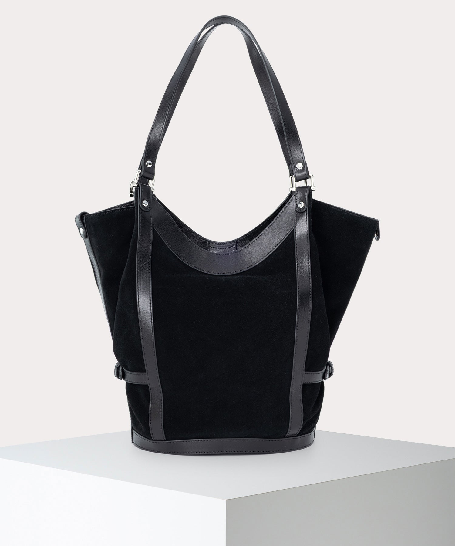 柔らかくゆるっとカーブしたレザーのストラップを重ね、まるでハーネスのようにトートを引き締めるディテールが特長の「SUEDE OLIVE ショルダーバッグL」。口元にあるスナップボタンでバックの形を簡単に変えることも可能です。