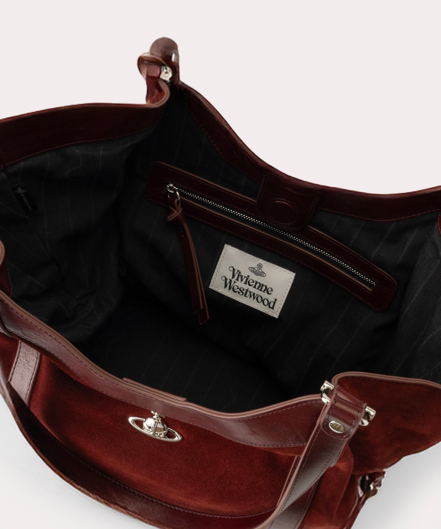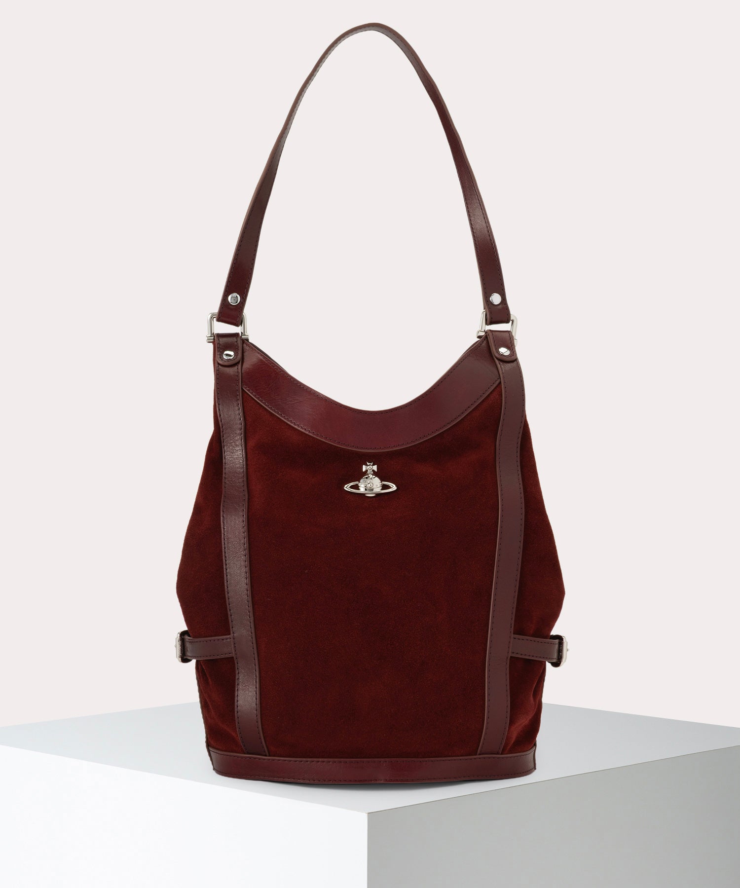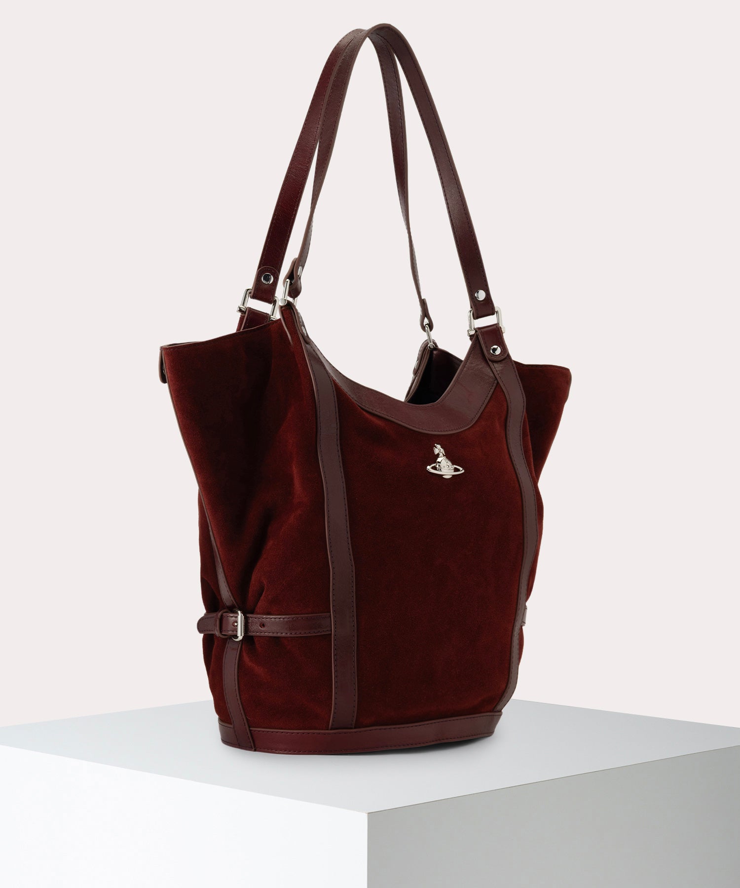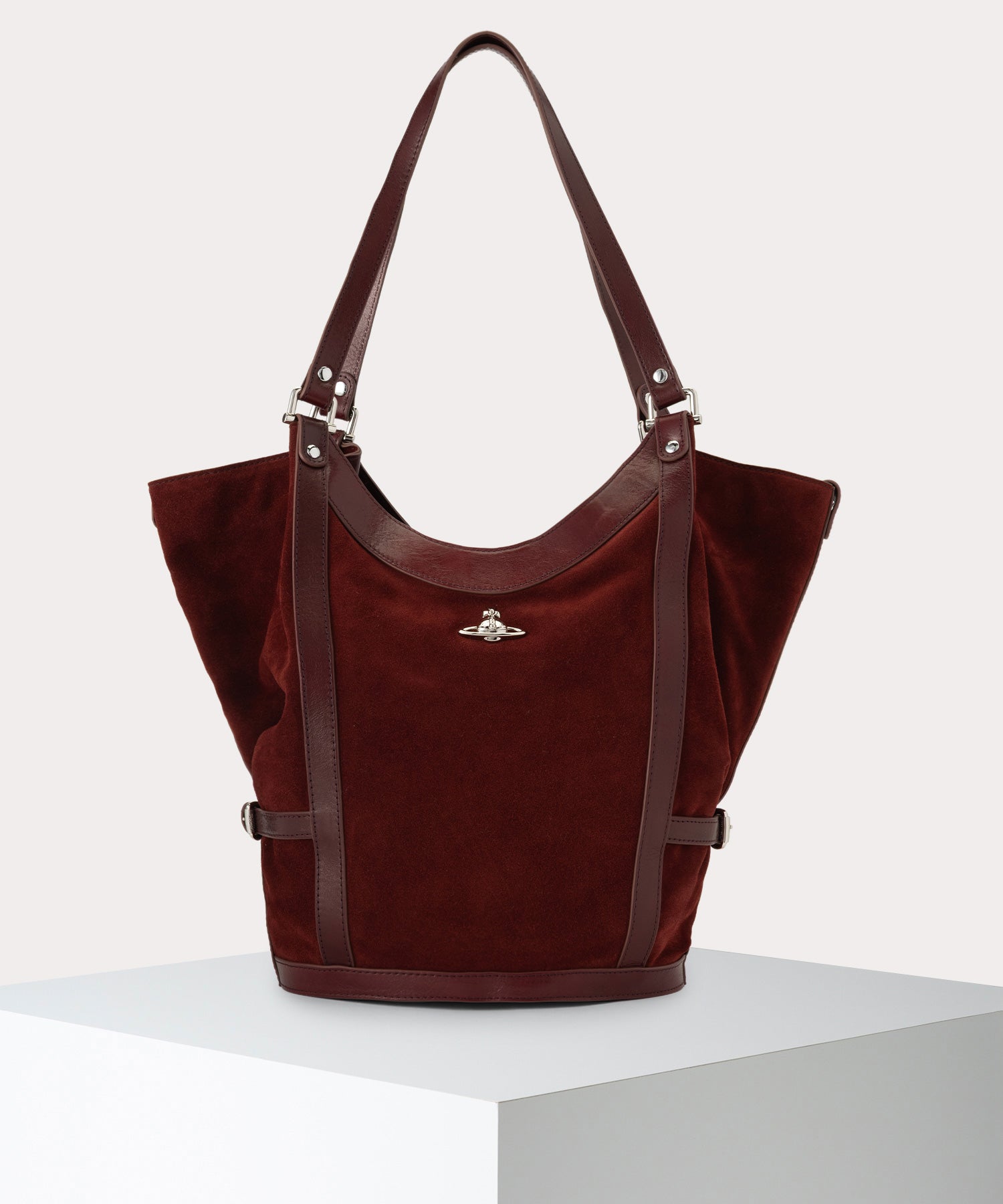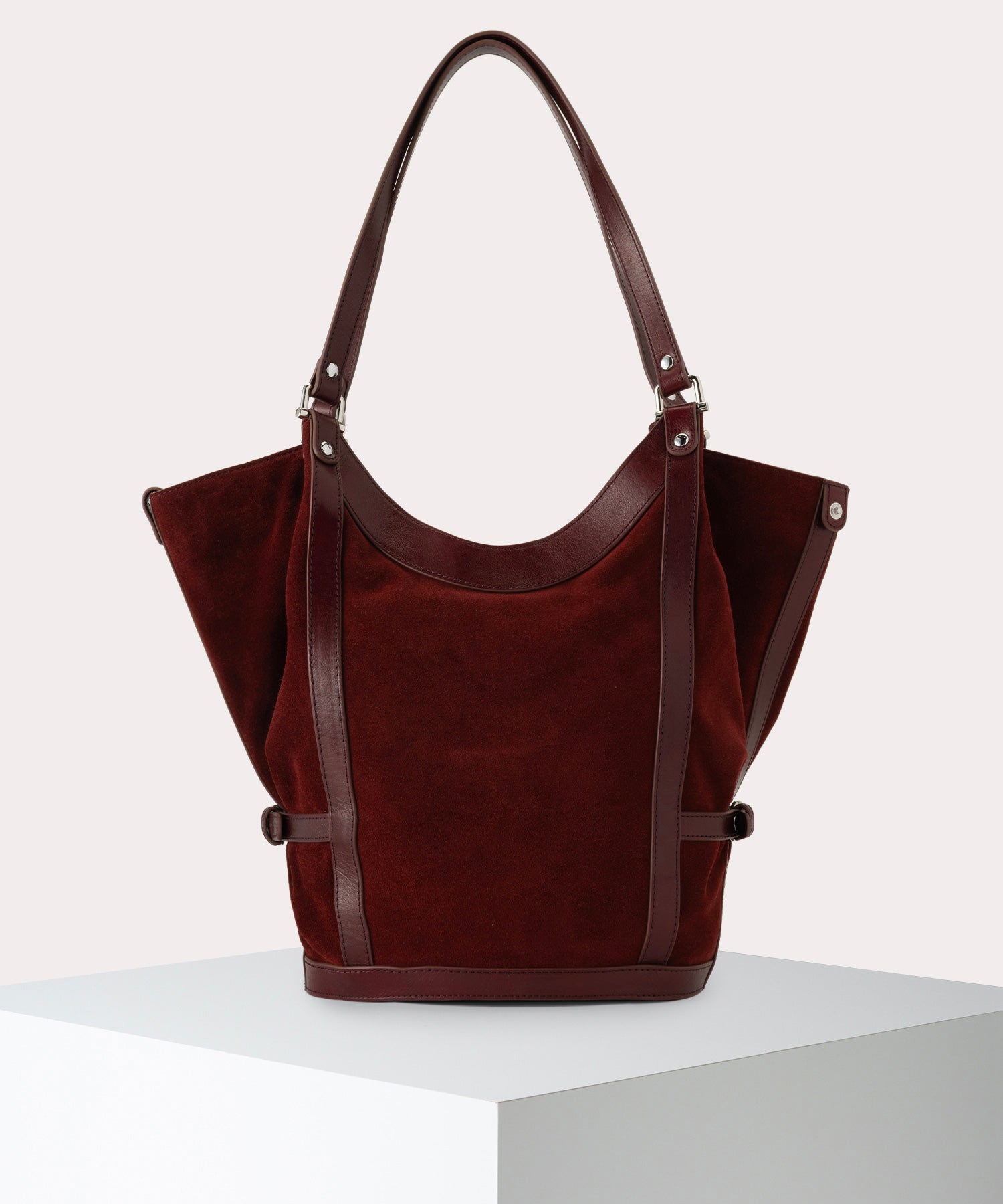 柔らかくゆるっとカーブしたレザーのストラップを重ね、まるでハーネスのようにトートを引き締めるディテールが特長の「SUEDE OLIVE ショルダーバッグL」。口元にあるスナップボタンでバックの形を簡単に変えることも可能です。