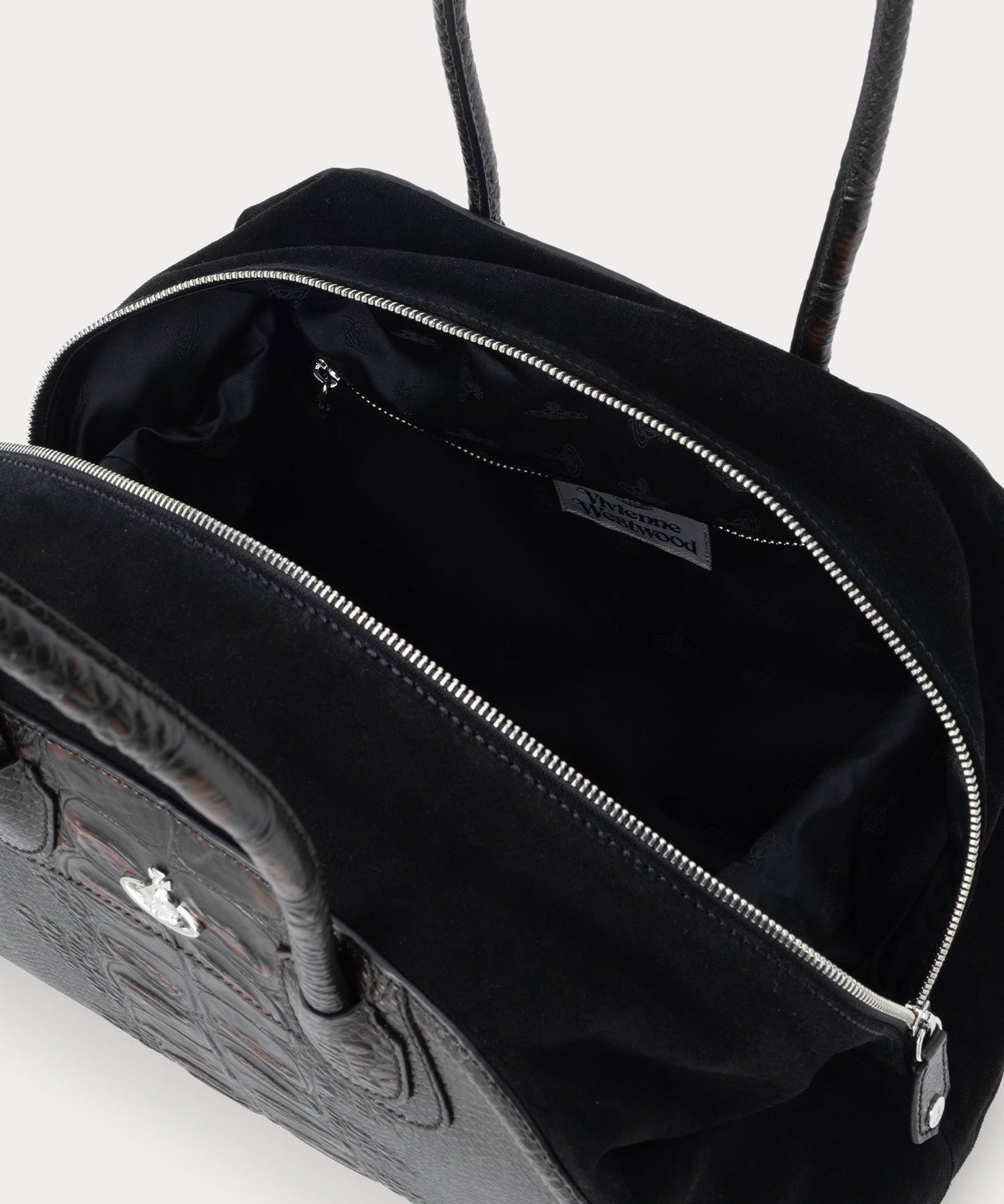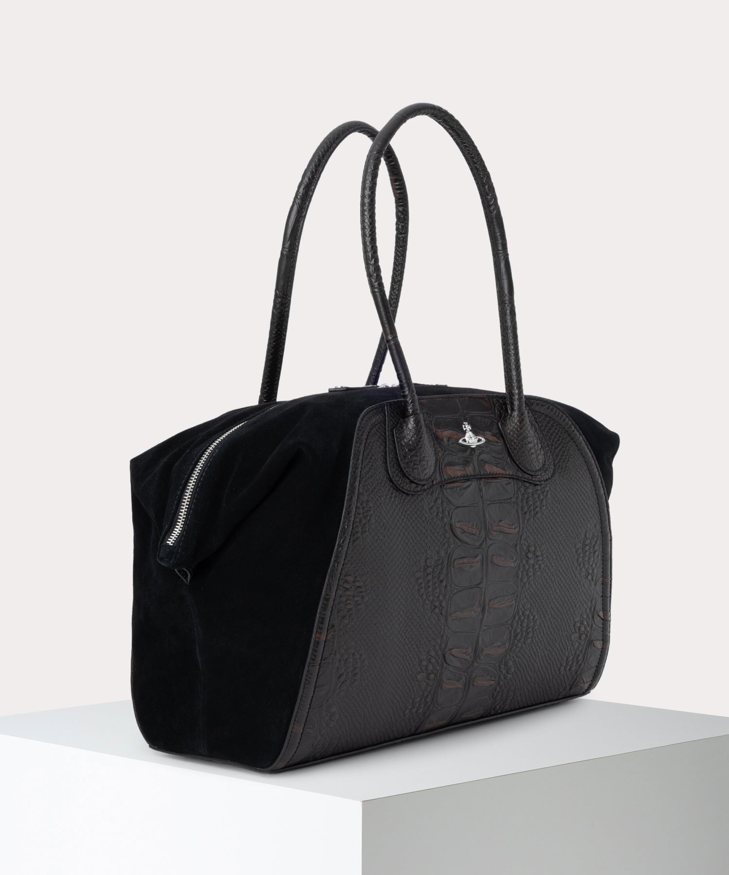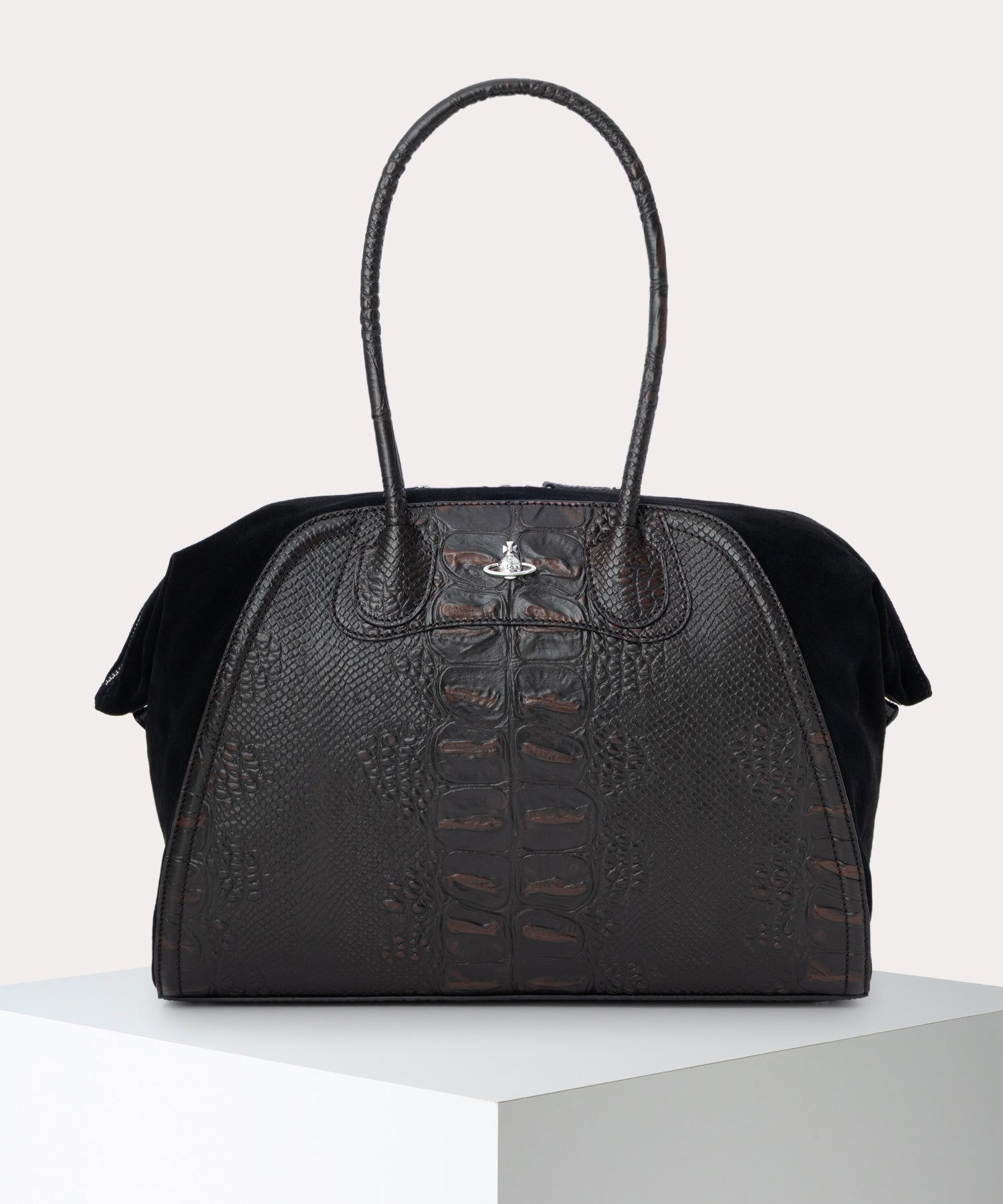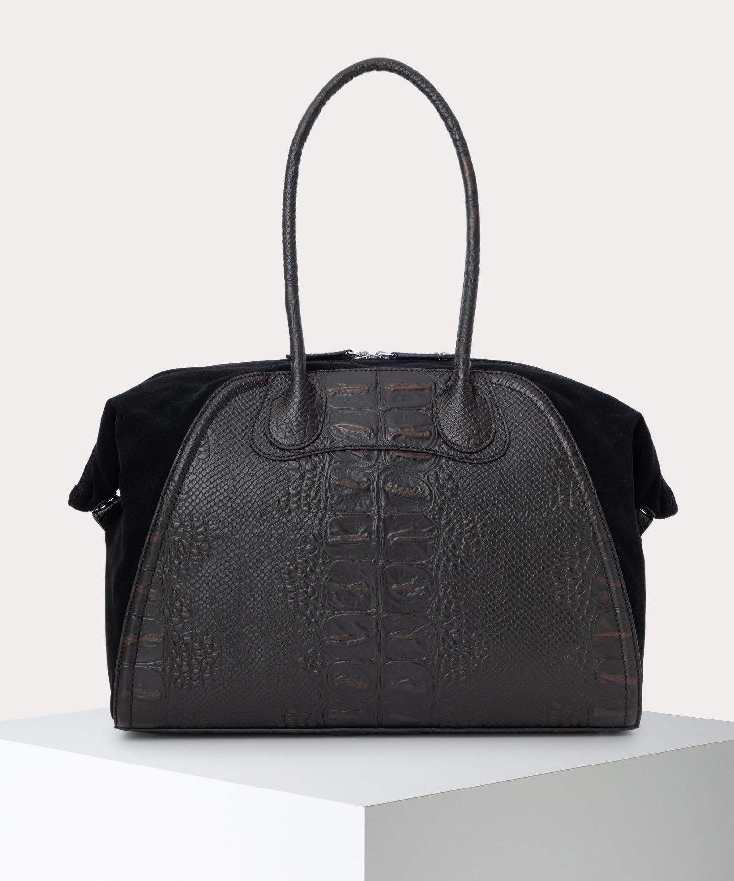 Vivienne Westwoodの象徴的なYASMINEのシルエットとピクニックブランケットからインスピレーションを得た「SHIRLEY ホールドオールバッグ」。スエードのマチと美しく丸みを帯びたハンドルがこのバッグをモダンで洗練された印象に仕上げています。広々としたドレープ状のマチは必要に応じて収納力を高めます。