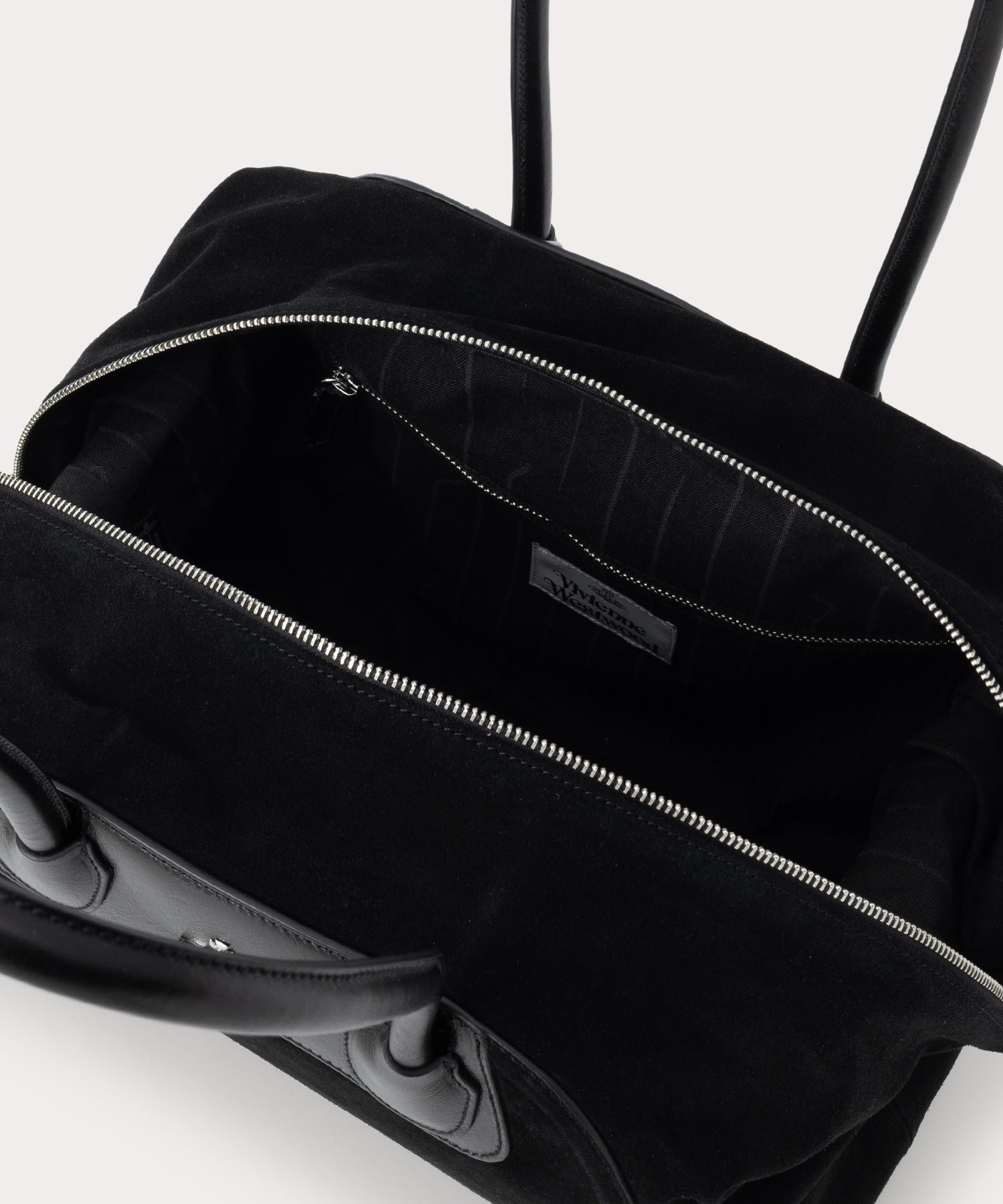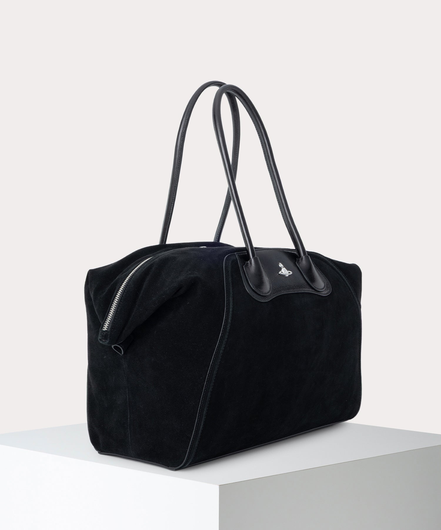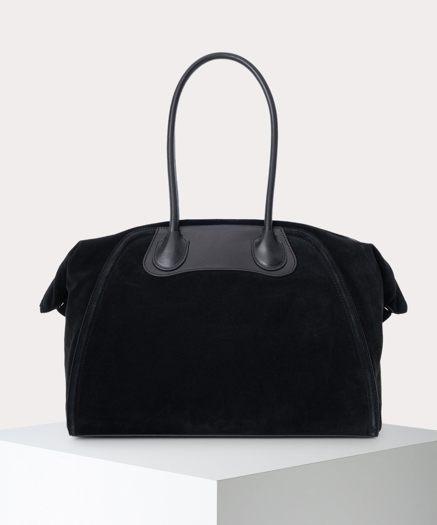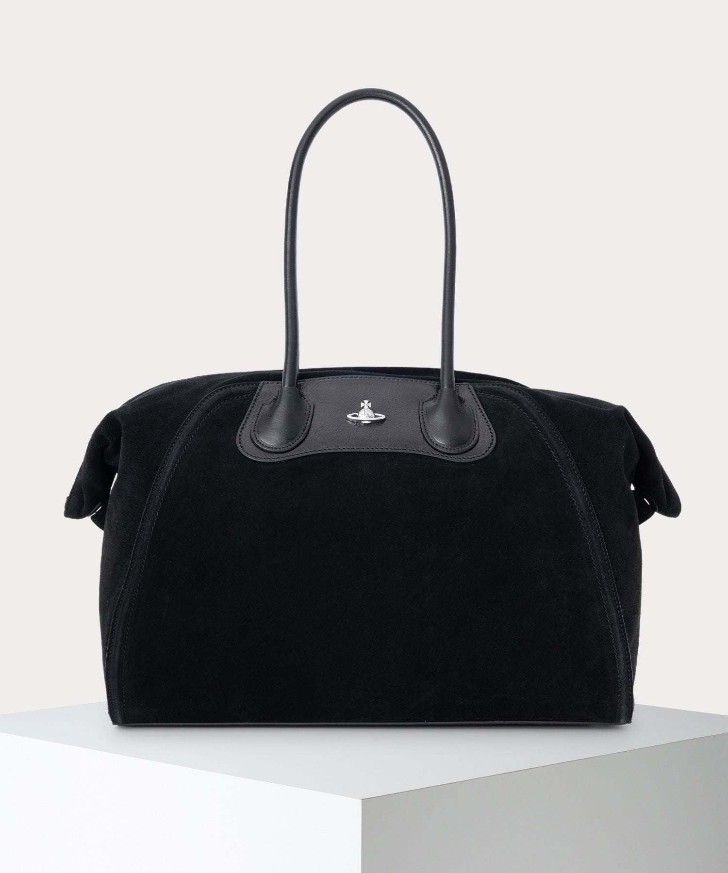 Vivienne Westwoodの象徴的なYASMINEのシルエットとピクニックブランケットからインスピレーションを得た「SHIRLEY ホールドオールバッグ」。スエードのマチと美しく丸みを帯びたハンドルがこのバッグをモダンで洗練された印象に仕上げています。広々としたドレープ状のマチは必要に応じて収納力を高めます。