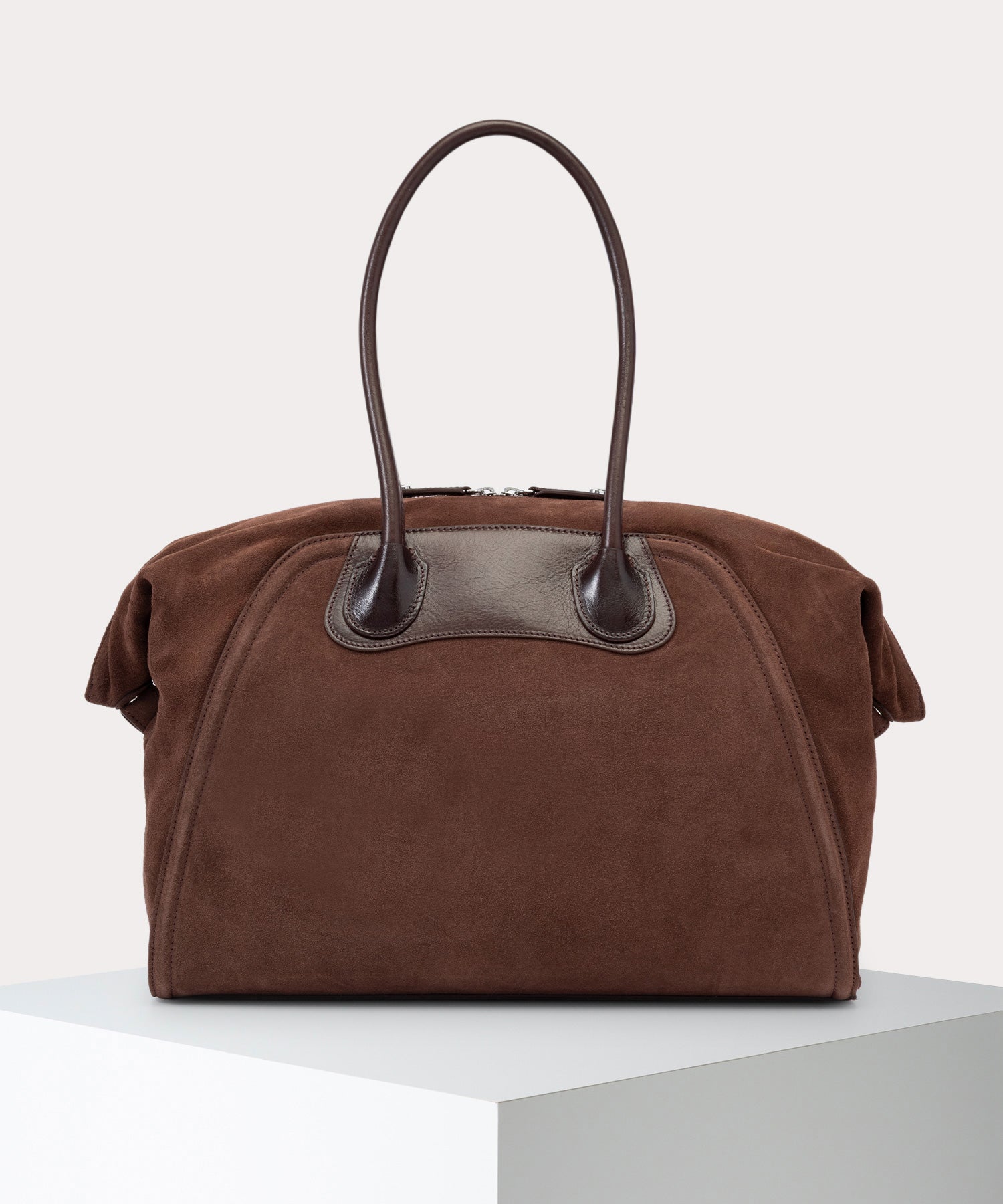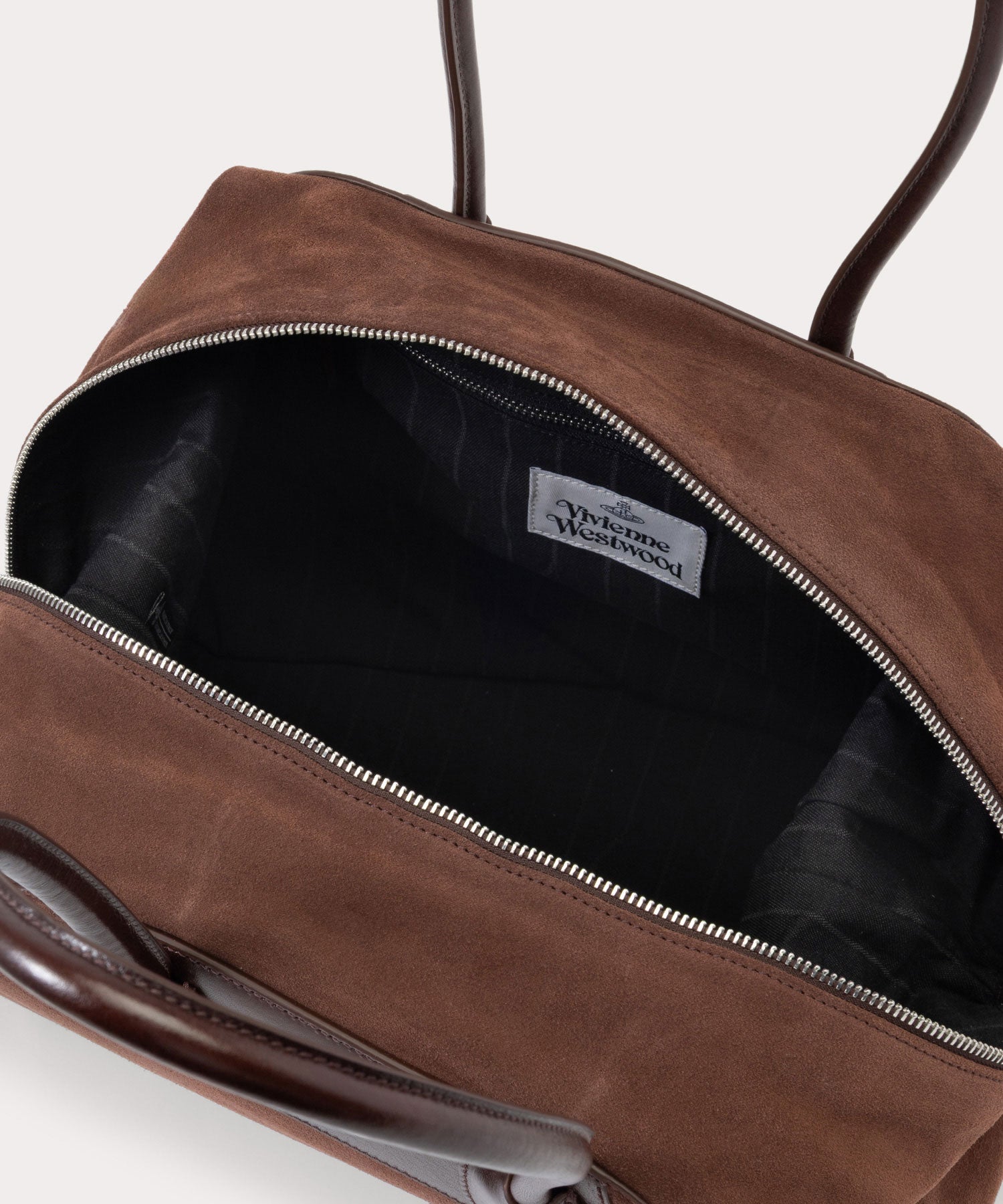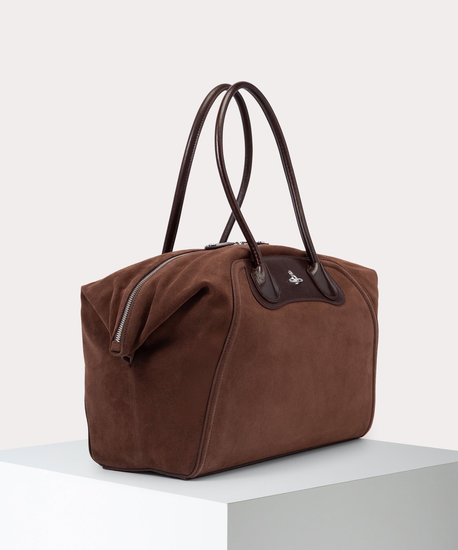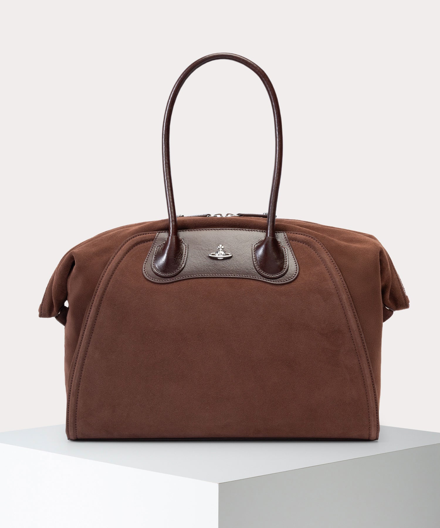 Vivienne Westwoodの象徴的なYASMINEのシルエットとピクニックブランケットからインスピレーションを得た「SHIRLEY ホールドオールバッグ」。スエードのマチと美しく丸みを帯びたハンドルがこのバッグをモダンで洗練された印象に仕上げています。広々としたドレープ状のマチは必要に応じて収納力を高めます。