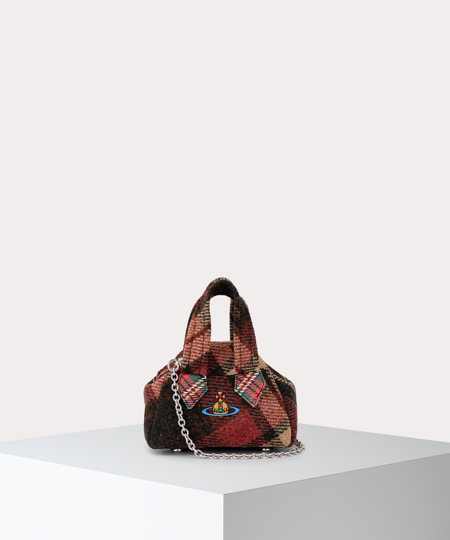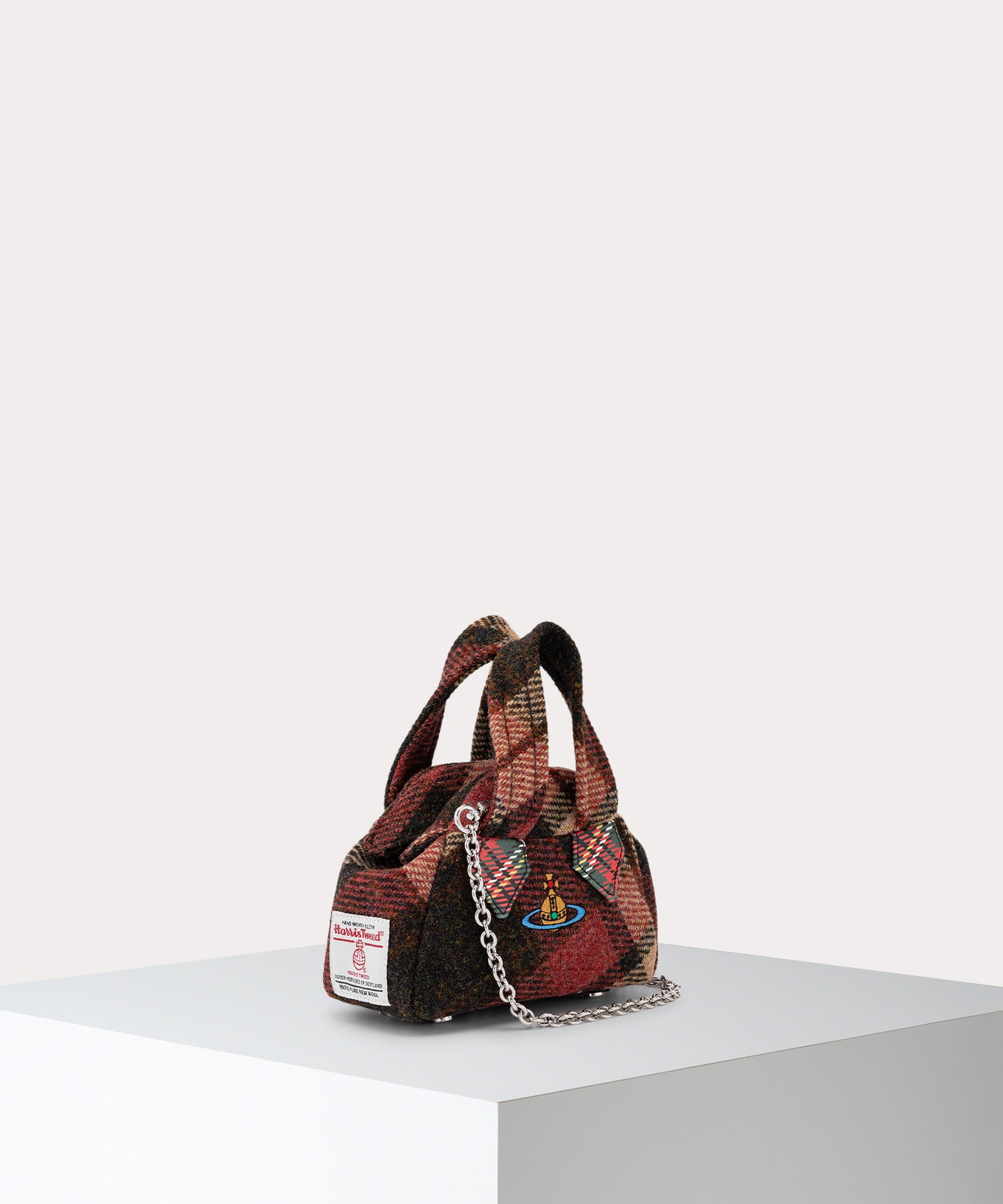 ブランドの歴史を象徴してきたアイコンバッグ「YASMINE」を、愛らしいミニサイズで現代に蘇らせた「HARRIS TWEED CHECK ARCHIVE ミニハンドバッグ」。スコットランドの職人が手織りした伝統のハリスツイードで仕立てられた柔らかなボディには、カラーORBが温もりを添えます。バッグを開けるたびに現れるアイコニックなユニオンジャック柄の裏地は、内に秘めたパンクなエスプリを象徴。付属のチェーンでショルダーバッグとしても楽しめ、日常のスタイルを特別なものへと格上げします。