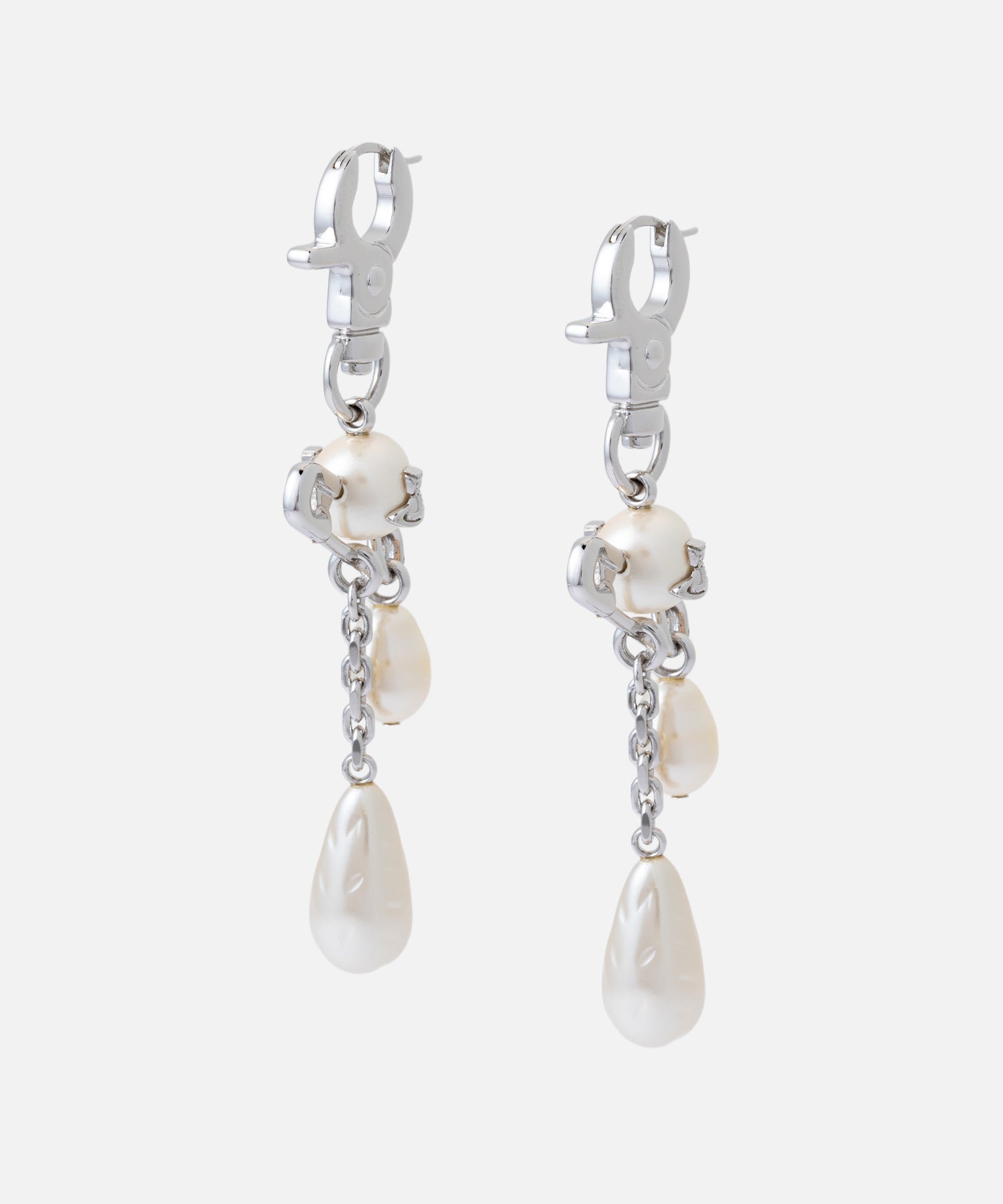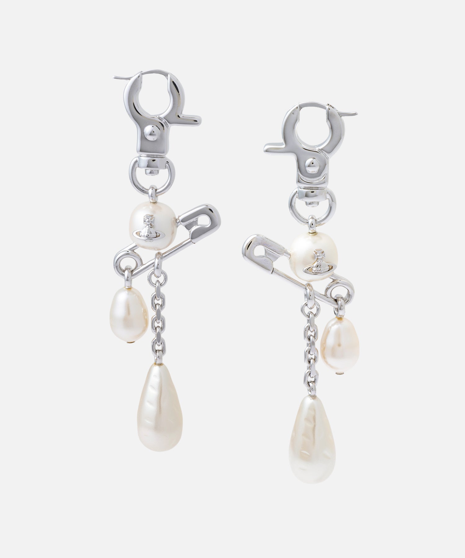 丸みを帯びたパールの中央にORBをあしらった「CLAUDE LONG ピアス」。ヴィヴィアンのパンクにインスパイアされた型にはまらない美学を象徴する安全ピンのディテールがアクセントになっている環境に配慮し、リサイクルブラスとリサイクルガラスパールを使用しています。