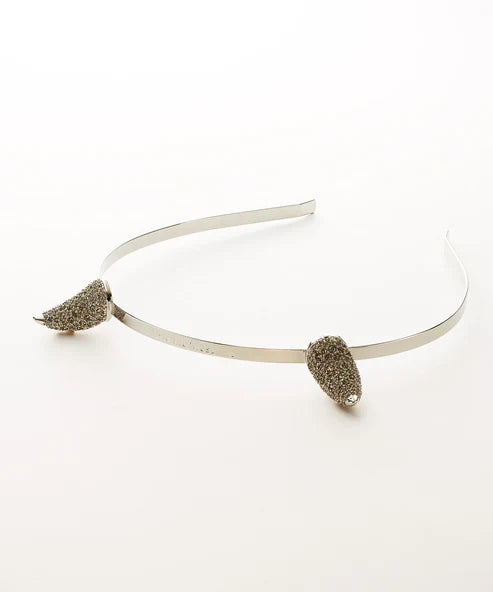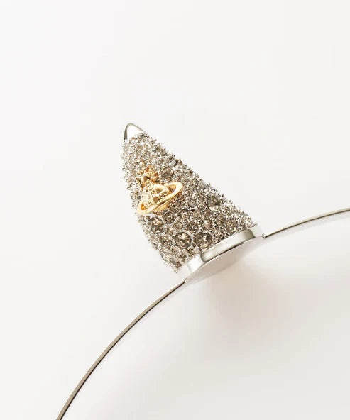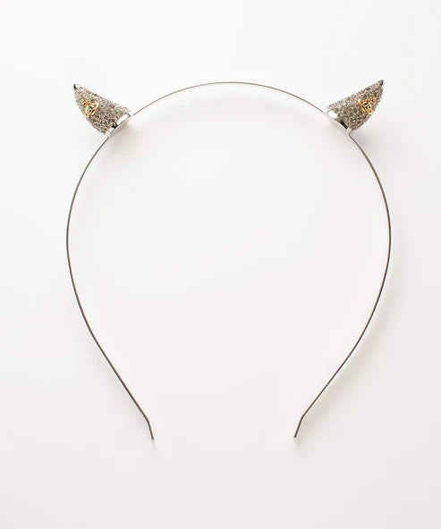 クラシックなディアマンテホーンをスリッポンヘッドバンドスタイルとして再考した「VIVIENNE'S HORN ALICE カチューシャ」。ホーンはクリスタルで装飾され、中心にはORBのメタルパーツを施した華やかなアイテム。