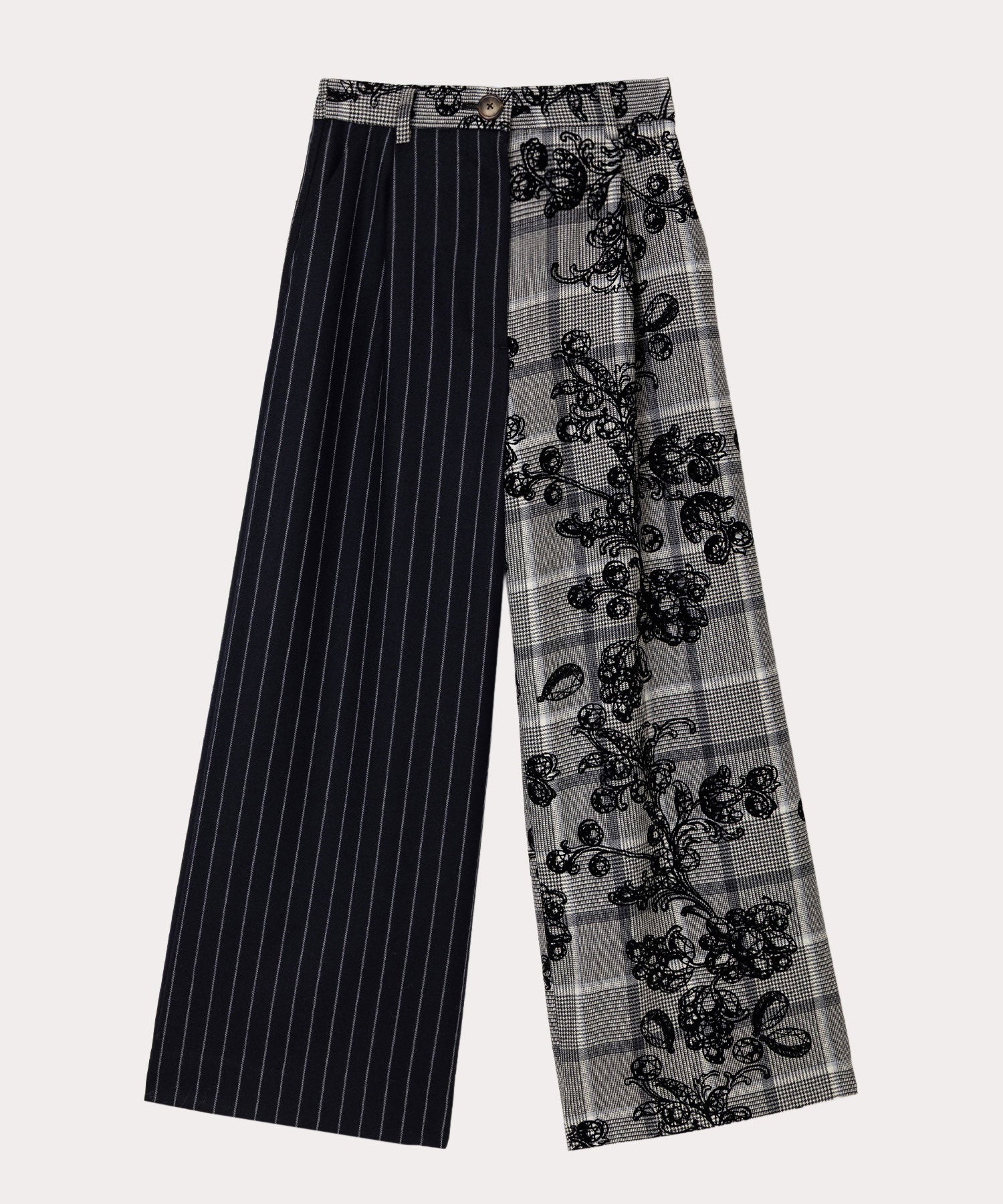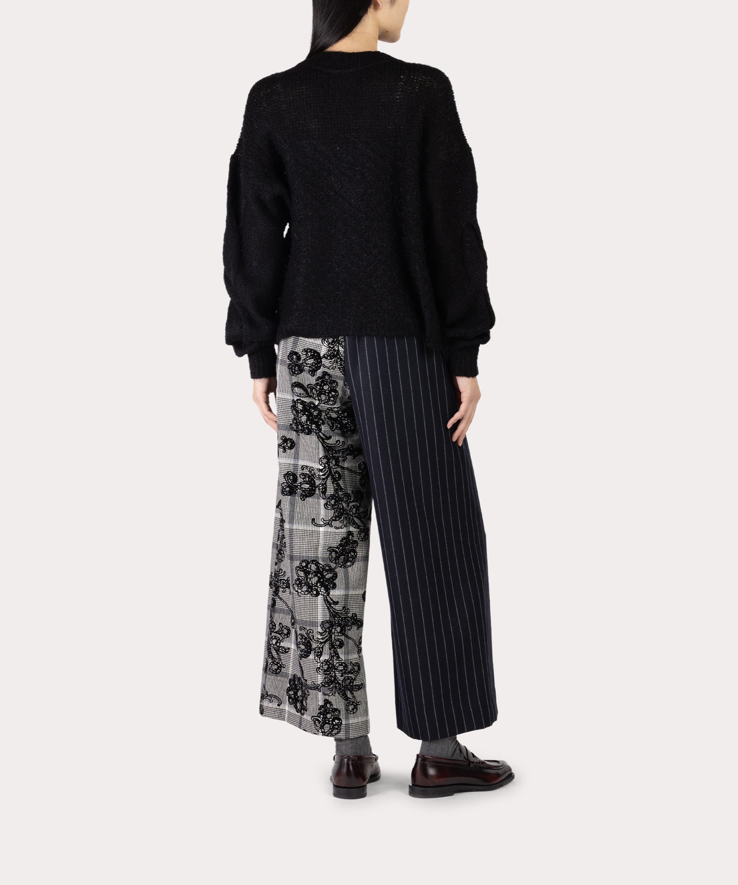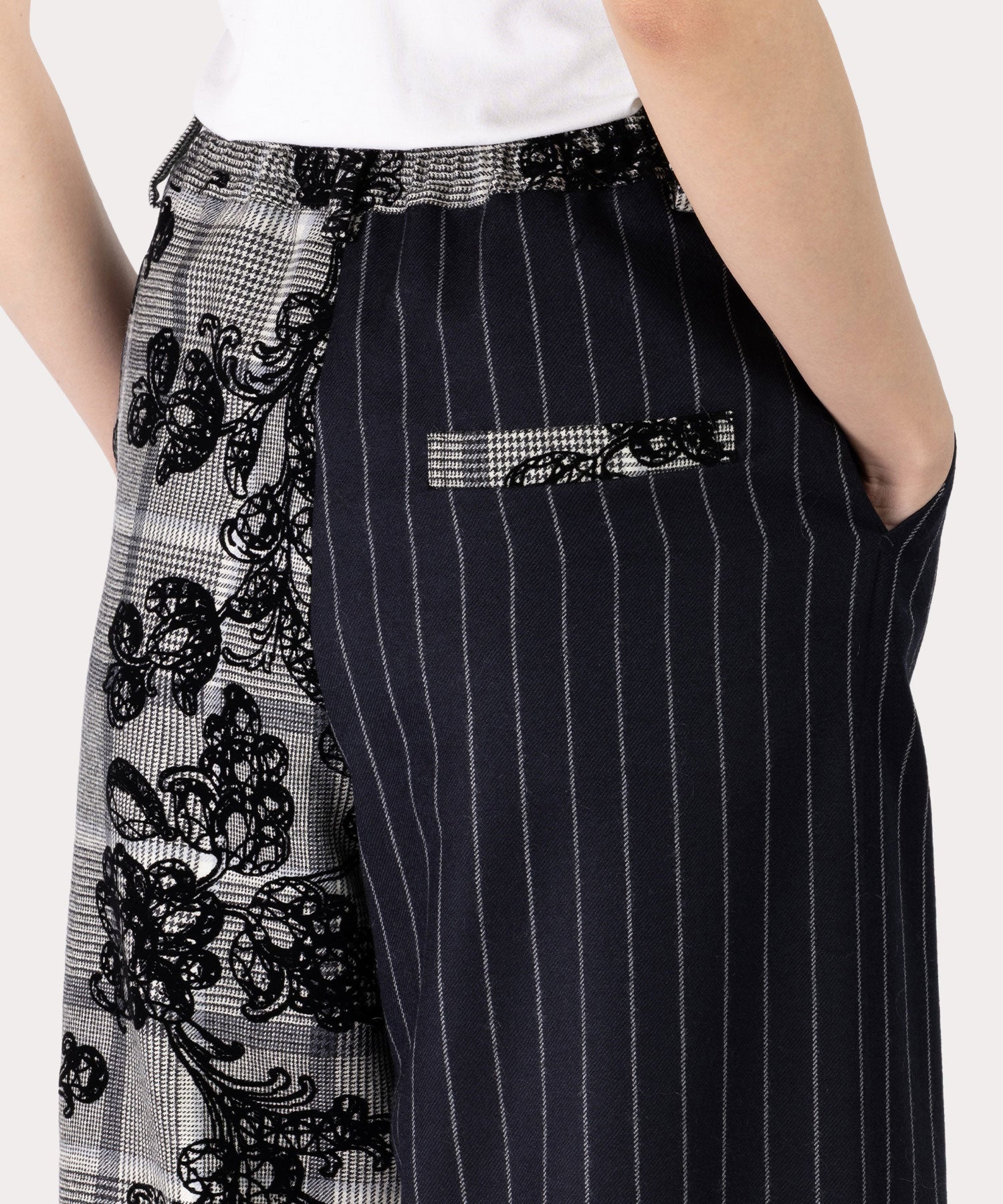 紙の張り子で作成されたヴィヴィアンのペーパージュエリーを連ねて仕上げたゴージャスな総柄の「MANNOR WALLPAPER タックワイドトラウザーズ」。後ろはゴム仕様のワイドシルエットが着心地良く、歩くたび綺麗なシルエットが特徴。